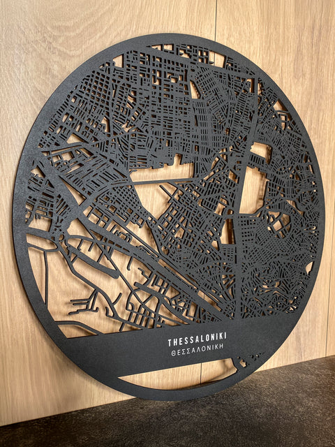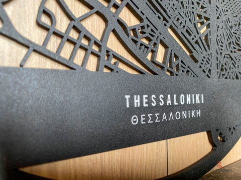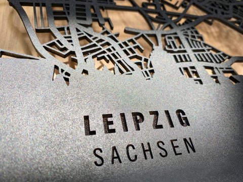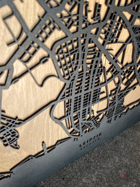 Dieses Produkt wird aus 3 mm starkem MDF gefertigt. Dabei werden die Zwischenräume ausgeschnitten, wodurch das filigrane Straßennetz und ggf. Wunschmotive sichtbar werden.
